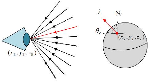 7维全光函数(Plenoptic Function)P(x, y, z, θ, Φ, λ, t),每一条光线的唯一函数表示 P(x轴,y轴,z轴,水平面角度/‘θi:tə/ ,垂直面角度/fai/ ,颜色/'læmdə/ ,飞行时间)用(x, y, z)表示人眼在三维空间中的位置坐标。光线可以从不同的角度进入人眼,用(θ, Φ)表示进入人眼光线的水平夹角和垂直夹角。每条光线具有不同的颜色和亮度,可以用光线的波长(λ)来统一表示。进入人眼的光线随着时间(t)的推移会发生变化。因此三维世界中的光线可以表示为7个维度的全光函数(Plenoptic Function, Plen-前缀具有“全能的、万金油”的意思)