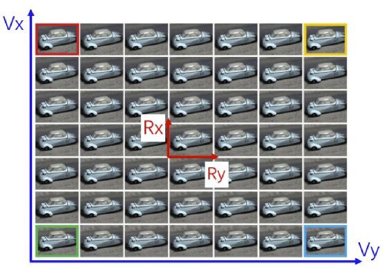 基于4D光场模型采集光场的显示,4D光场数据可以表示为P(Vx, Vy, Rx, Ry),其中(Vx, Vy)表征了角度分辨率,表示有Vx*Vy个视点(View)图像;(Rx, Ry)表征视点图像分辨率,表示单个视点图像的分辨率为Rx*Ry。如图展示了7x7光场的可视化,表示共有49个视点图像,每个视点的图像分辨率为384x512。P(7,7,384,512)视点图像分辨率越高,包含的细节越多。角度分辨率越高,单位角度内视点数量越多,视差过度就越平滑。