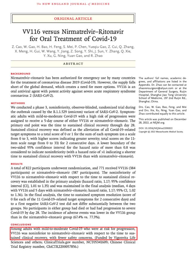 VV116的试验成果能够在《新英格兰》医学杂志发表,这意味着,它得到了国际医学界的认可。要知道,《新英格兰》是全球影响因子排名第一的顶尖权威期刊。未来,VV116将不只是供应于中国市场,还将打入国际市场,和辉瑞Paxlovid一样供应全球,为全人类对抗新冠病毒提供更多的新工具,向世界贡献中国智慧。
