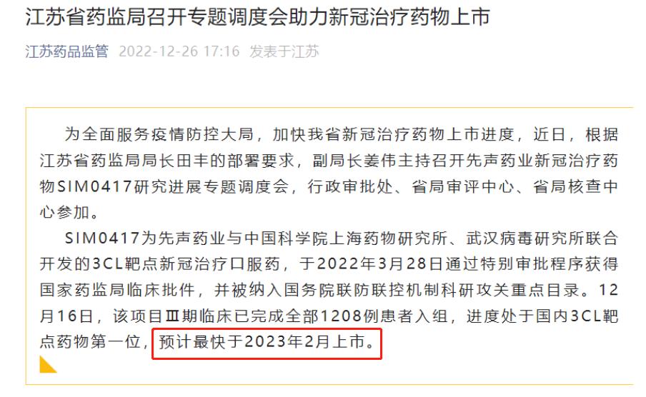 除了君实生物研发的国产新冠“特效药”VV116取得重大成功外,由先声药业联合中科院旗下上海药物研究所和武汉病毒研究所研发的另一款国产新冠特效药SIM0417也取得重大进展,预计最快能在2023年2月上市。