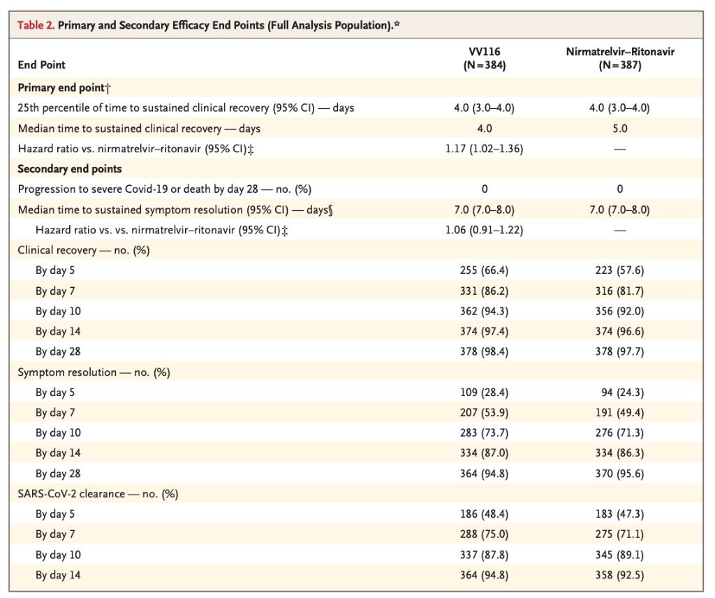 简单地说就是,让VV116和辉瑞Paxlovid真枪实刀地打擂台,看看谁的治疗效果更好。试验由上海交通大学附属瑞金医院牵头,对测试患者按1比1分成VV116组和Paxlovid组,VV116组纳入病例384人,Paxlovid组纳入病例387人。