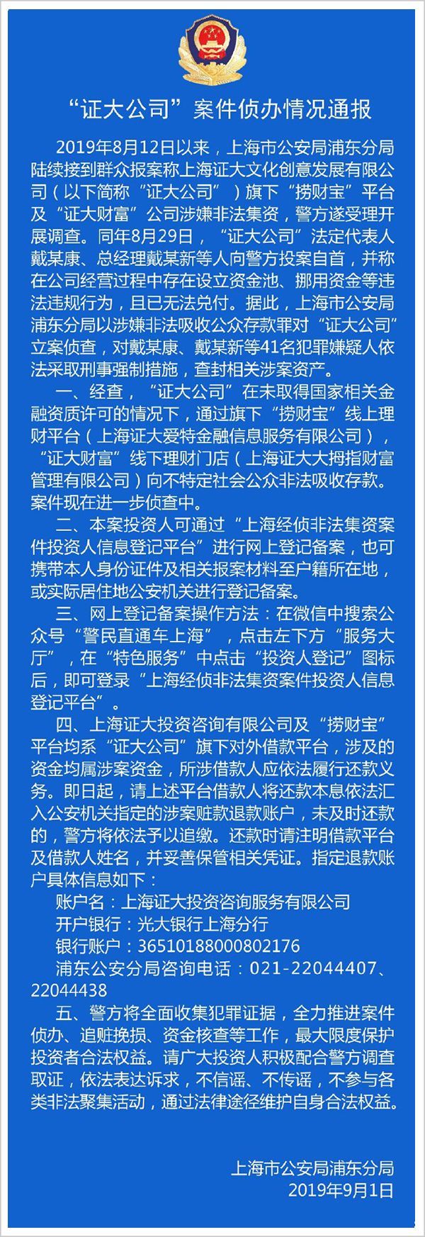 2019年上海警方的公告,则明确将上述平台的案件定性为非法集资案。“‘证大公司’法定代表人戴某康、总经理戴某新等人向警方投案自首,并称在公司经营过程中存在设立资金池、挪用资金等违法违规行为,且已无法兑付。”