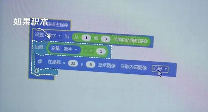 在讲解 “if短语”时,她融入了剪刀石头布游戏。学生利用如果积木和随机数积木来编程,能随机抽取剪刀、石头和布的图案,并在连接电脑的套件工具中显示。