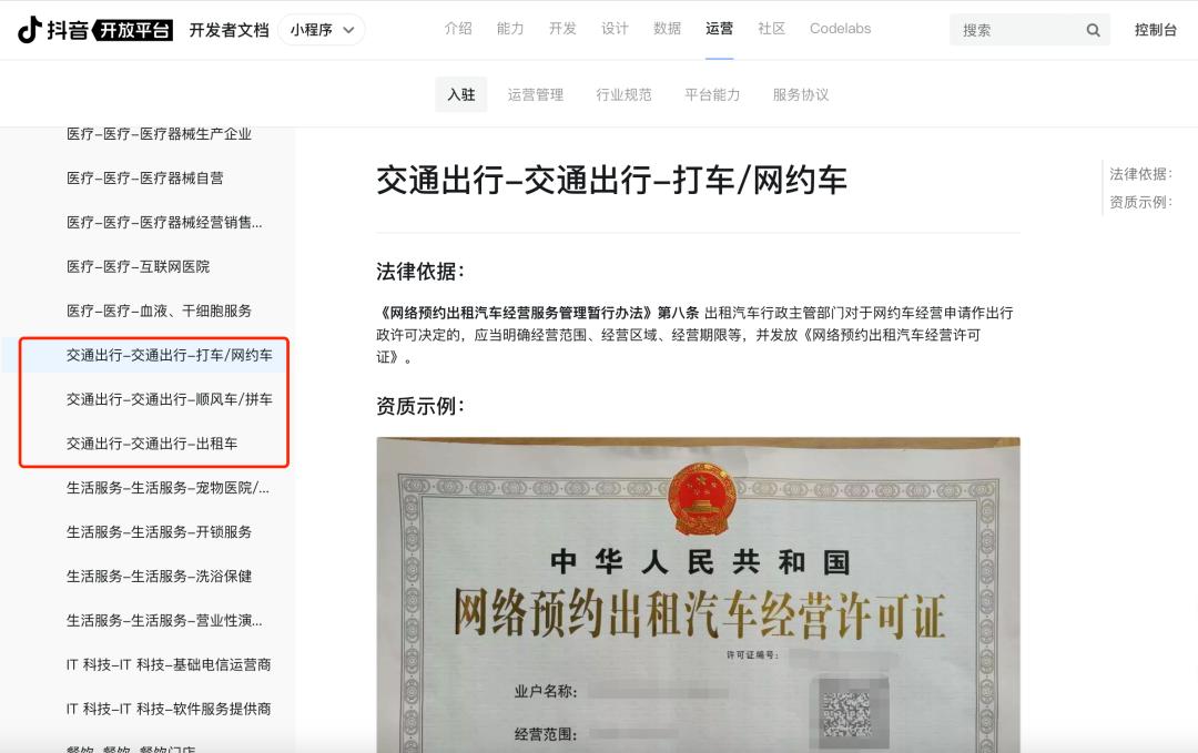 最近,抖音开放了交通出行服务的平台服务商入驻资格,在抖音开放平台可以看到,在交通出行的入驻栏中,出现了打车/网约车、顺风车/拼车、出租车的选项。据了解,T3出行、一喂顺风车以及一众本地出行服务平台都已入驻抖音小程序。