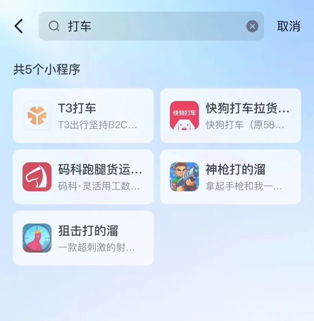 与此同时,微信在九宫格的“出行服务”内,推出了全新的聚合打车功能,接入了美团打车、曹操出行、T3出行、阳光出行、首汽约车等多个打车平台,覆盖了全国多个城市。