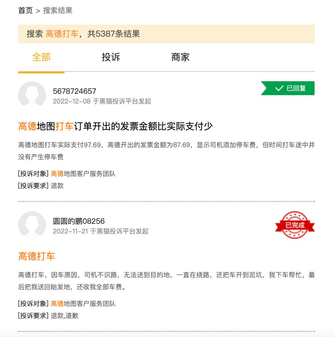 在黑猫投诉上,关于高德打车的投诉多达五千多条,大多都是平台乱收费,而消费者维权无门。