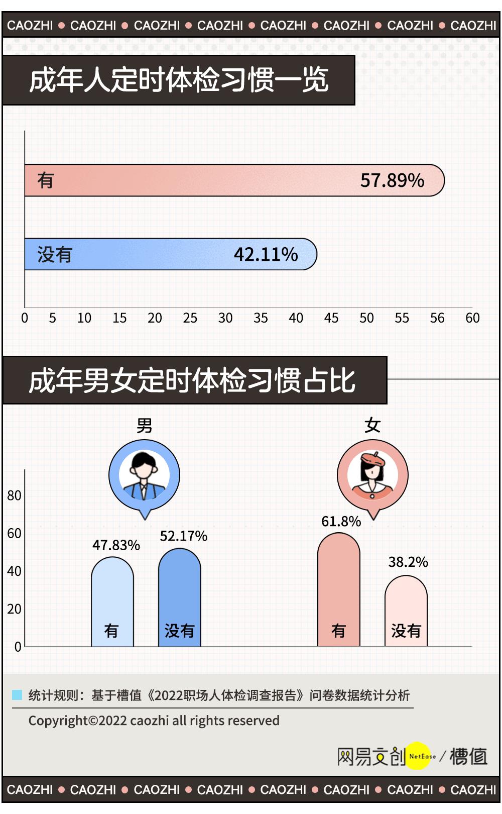 女性朋友中会定时体检的比例为61.8%,男性则为52.17%,相差了将近10个百分点。