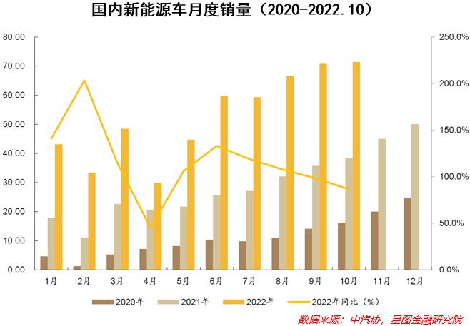 从国内市场的驱动因素看,政策端购置税减免及购车补贴政策的延续,一定程度上刺激了国内市场需求的提前爆发。同时,由于2022年初俄乌冲突的爆发,油价高涨并全年处于高位,新能车相对于燃油车的性价比凸显。根据中汽协数据,2022年1-10月,国内新能源汽车销量为609万辆,同比增长超过100%,渗透率在11月单月达到36.3%,预计全年国内新能源车销量将超过700万辆。
