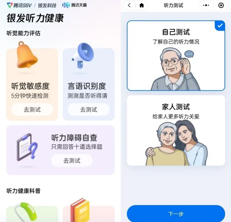 小程序包含“听觉能力评估”与“听力健康科普”两大版块内容。其中,听觉能力评估从“听觉敏感度”“言语识别度”“听力障碍自查”三个维度帮助老年人进行听觉能力测试。
