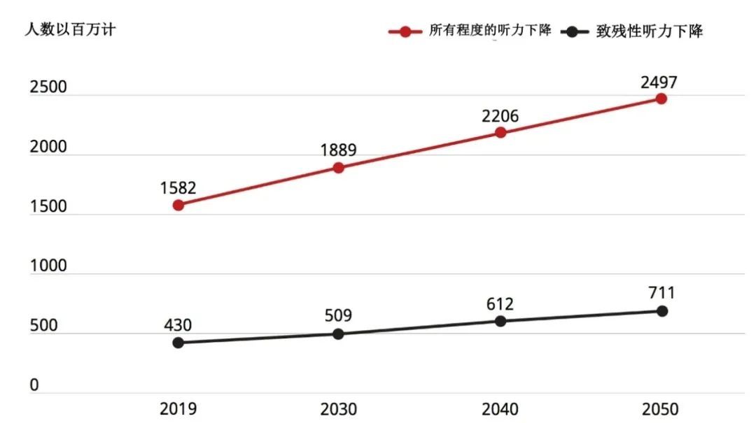 2021年,世界卫生组织发布的《世界听力报告》显示,听力损失目前影响着全球超过15亿人。据估计,2025年全世界60岁以上人群中,将有超过5亿人口遭受老年性耳聋。