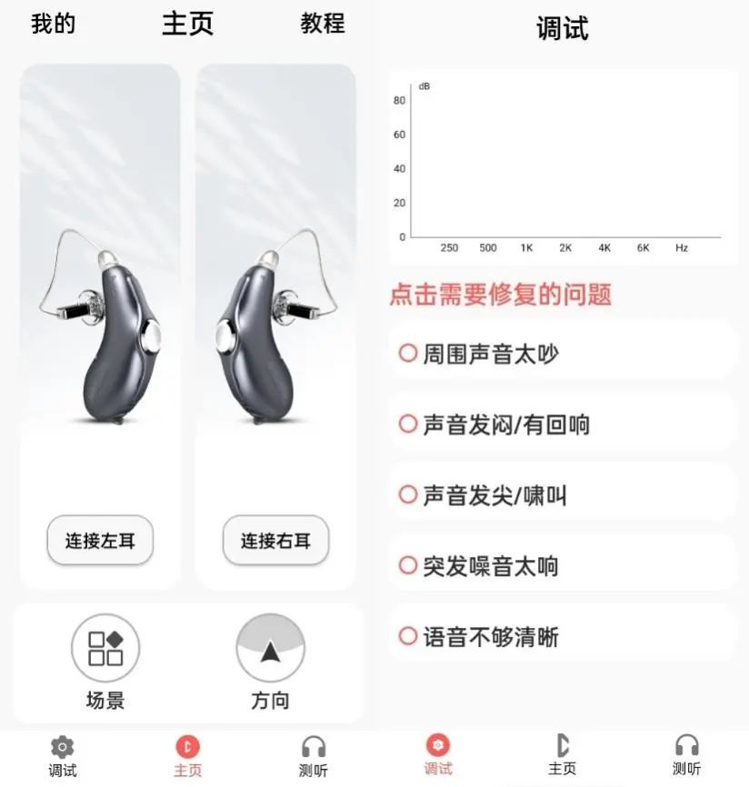下载挚听APP,链接设备后,可直接通过APP对“周围声音太吵”“声音发闷、有回响”“声音发尖/啸叫”“突发噪音太响”“语音不够清晰”五大问题进行调试修复。