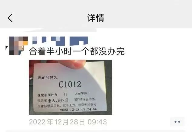 挂号还算顺利,但没想到在现场办理环节出了岔子。28日我请了半天假,9点半左右取号时排在第12位,但票号上却显示前面还有11人等待办理,合着出入境办理大厅9点上班后,一个人都没给办理。