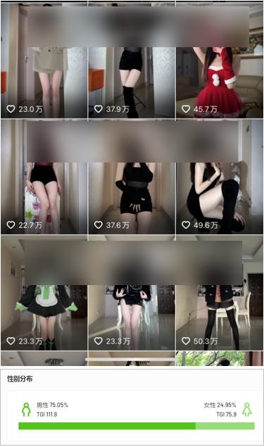 现在一些颜值博主会靠晒脸、晒身材来获得流量,内容点赞和涨粉虽快,但也有一个弊端——积累的都是“商业价值较低”的男粉。比如这位抖音美女达人的视频受众中,超 75% 都是男性用户。