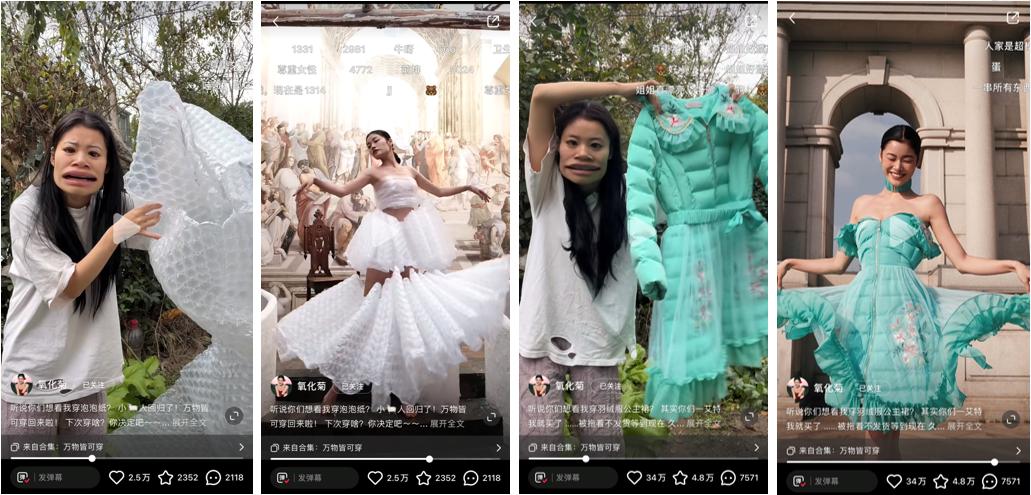 在其他变装视频里,氧化菊还将尿素袋、瑜伽垫穿在身上。这个“万物皆可穿”的视频系列在小红书轻松拿下数万赞,在抖音更是获赞百万,这一火就是火了三四个月。
