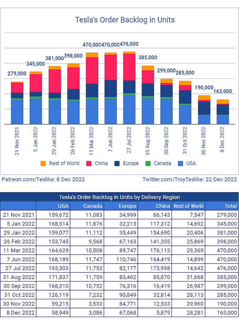 截至2022年12月22日,特斯拉在国内的积压订单仅剩5879辆,远低于7月份的17.4万辆;而特斯拉的全球订单目前也仅剩下16.3万辆,与7月份的47.6万辆相比减少近2/3。