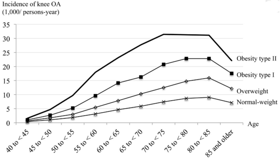 5.Reyes C, Leyland KM, Peat G, Cooper C, Arden NK, Prieto-Alhambra D. Association Between Overweight and Obesity and Risk of Clinically Diagnosed Knee, Hip, and Hand Osteoarthritis: A Population-Based Cohort Study. Arthritis Rheumatol. 2016 Aug;68(8):1869-75. doi: 10.1002/art.39707. PMID: 27059260; PMCID: PMC4966641.
