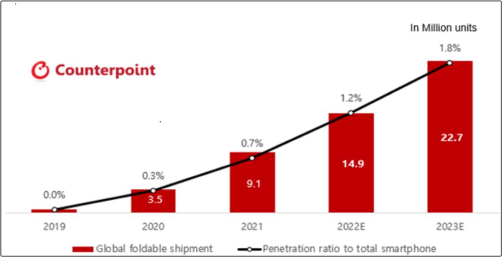 第三方机构Counterpoint Research的报告显示,2023财年全球可折叠智能手机出货量预计将同比增长52%,达到2270万部;Omdia预计,到2026年全球折叠屏智能手机出货将达到6100万台,2021-2026年年均复合增速达46.6%,届时,折叠屏手机的渗透率将达到3.6%(当前约为1%)。