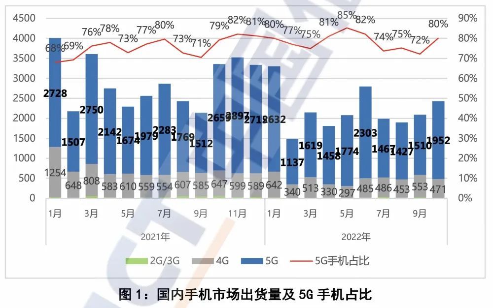 中国信通院最新数据显示,2022年前10个月,国内市场手机出货量累计2.20亿部,同比下降21.9%。全球市场来看,第三方市场机构 Counterpoint的统计数据显示,2022年第三季度,全球智能手机出货量为 3.01 亿部,同比下降 12%。其中,苹果成为前五大智能手机品牌(三星、苹果、小米、OPPO和vivo)中唯一同比增长的品牌。