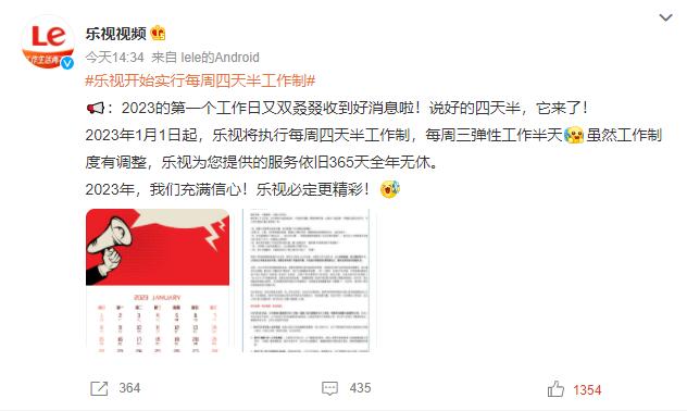 新年的第一个工作日,乐视发布公告称:2023年1月1日起,乐视将执行每周四天半工作制,每周三弹性工作半天。