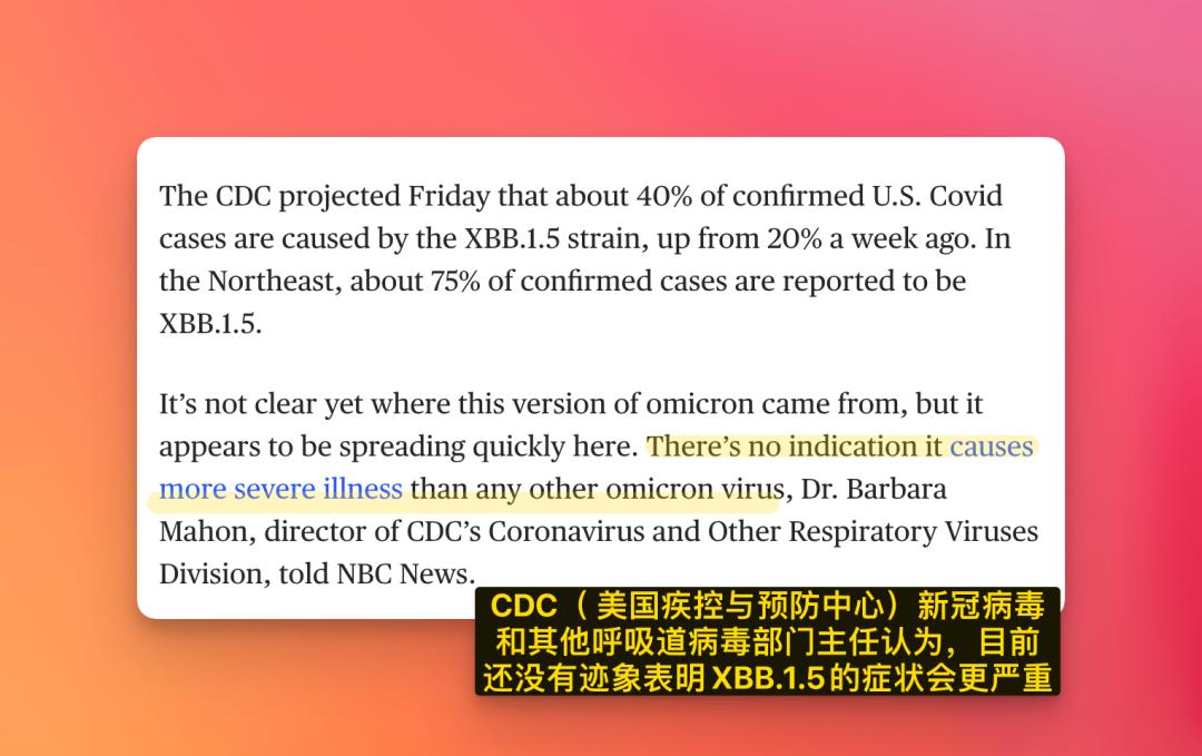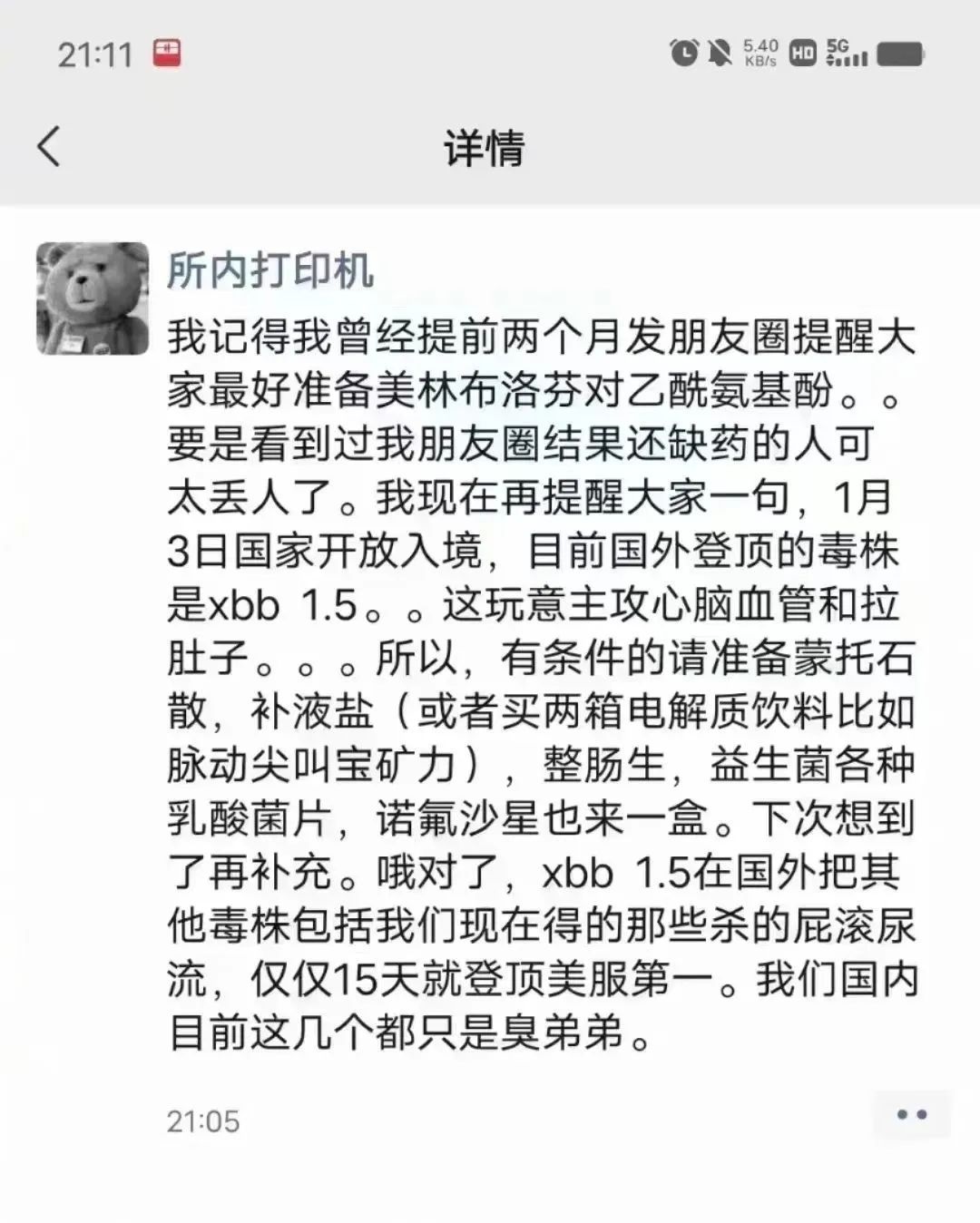 这条截图内容很简单,就是介绍国外有种叫 XBB.1.5 的毒株,主攻心脑血管,还会让你拉肚子,传播速度很快。相比之下,国内几个毒株只是臭弟弟。