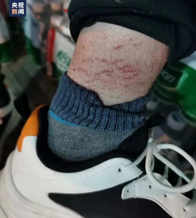 2022年12月中旬,寒风下的北京,一名骑手的脚腕被冻皴。 /央视新闻