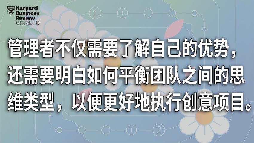 我们中的大多数人往往只会使用这四种方式中的一种进行思考,而清楚哪种方式是下意识产生的,将会使我们受益。我们还可以学习在其他方面磨练我们的创造力。管理者不仅需要了解自己的优势,还需要明白如何平衡团队之间的思维类型,以便更好地执行创意项目。同时,组织也可以利用这种分类来提高全体员工的创新能力。