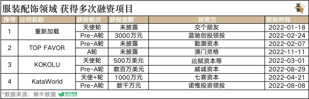 今年获得多轮融资的服装配饰项目有新锐鞋服品牌重新加载,其在1月份获得天使轮投资后,又于2月获得3000万Pre-A轮投资;可持续生活方式品牌KOKOLU也于3月和8月获投数百万美元。