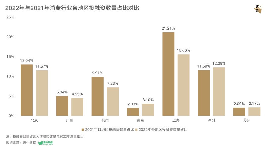 从地域分布来看,无论2021年还是2022年,消费领域的投融资都集中在一线城市,北京、上海、深圳、杭州合计占比约5成。