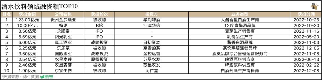 在酒水饮料领域,白酒和啤酒由于对供应链和营销成本投入较高,融资金额也名列前茅。