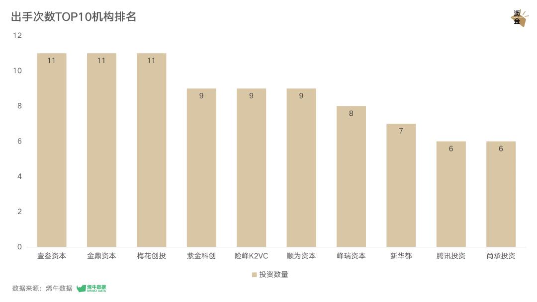 但即便如此,部分消费基金依然逆势起航。壹叁资本、金鼎资本和梅花创投今年的出手次数并列第一,分别有11次;其次是紫金科创、险峰和顺为资本,分别有9次。