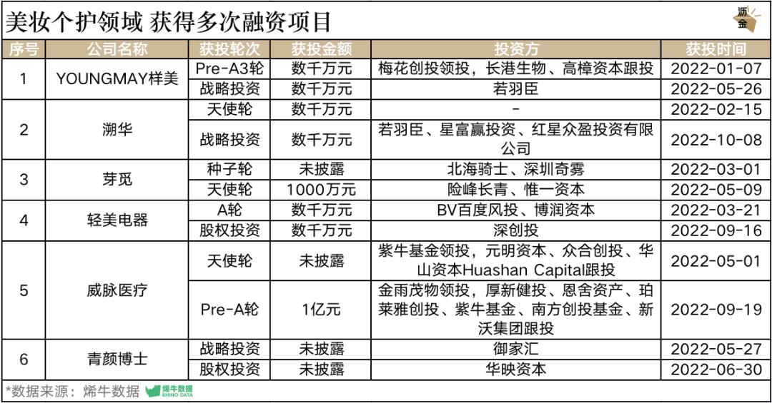 美妆个护领域也有部分公司获得多轮融资。威脉医疗作为微创及无创能量医学整体解决方案的提供商,于5月获得天使轮融资后,又于9月获得1亿元Pre- A轮融资;青颜博士专注女性健康护肤,也于年内两次获得融资。