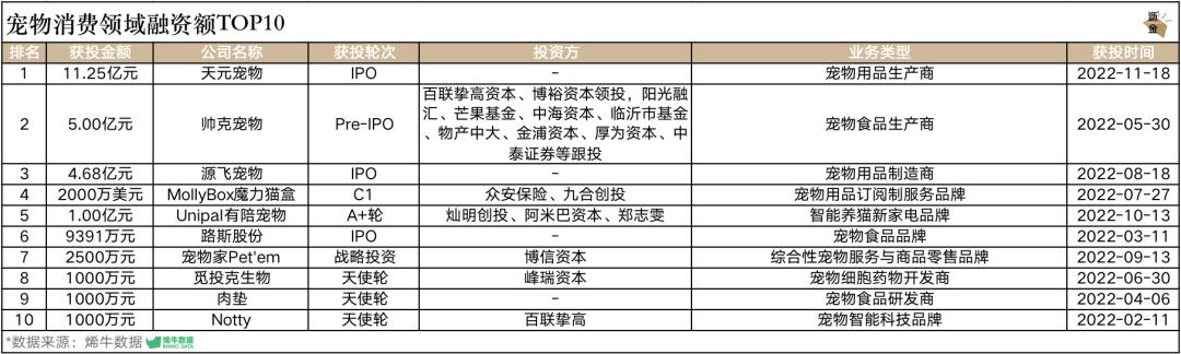 天元宠物在11月通过IPO获得11.25亿元融资,是今年宠物行业融资额最大的一笔;帅克宠物作为宠物食品生产商,通过自建品牌和生产线于今年5月获得Pre-IPO轮5亿元融资,投资方包括百联挚高资本、博裕资本领投,阳光融汇、芒果基金、中海资本等。
