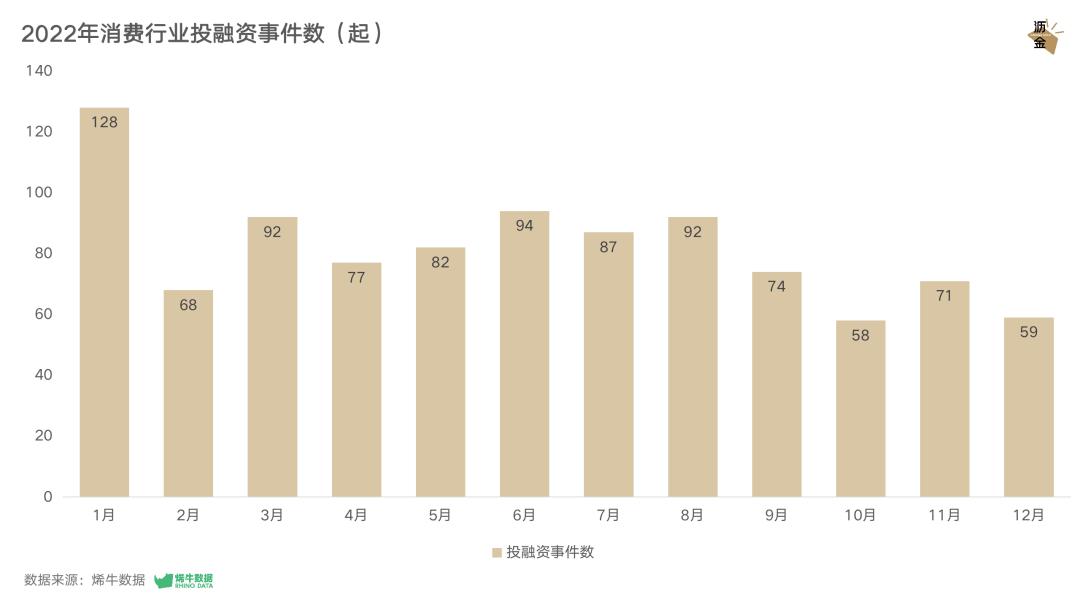 进一步看每月的融资数量,会发现在2022年1月,机构还对消费市场怀有憧憬,并且释放了部分需要在年前披露的项目,投融资数量达到全年最高的128起。