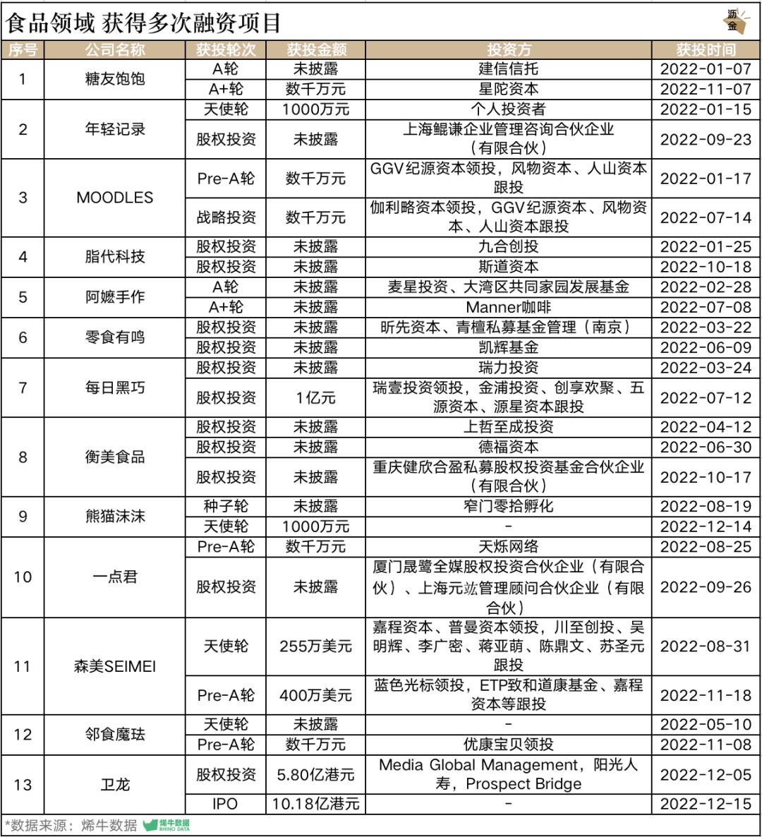 有部分企业还在2022年获得了多轮融资,比如卫龙在12月初获得5.8亿港元股权投资后,于12月中旬正式在港交所上市,完成IPO之路。