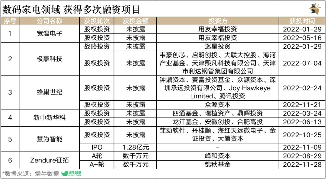 数码家电领域也有多家企业获得多轮融资,比如智慧校园服务提供商新中新华科,在年内两次获得股权投资;极豪科技和蜂巢世纪,一家消费电子供应商,一家创新类消费电子产品研发生产商,也于年内两次获得投资;慧为智能则通过IPO不断加深其在智能终端设备的研发。