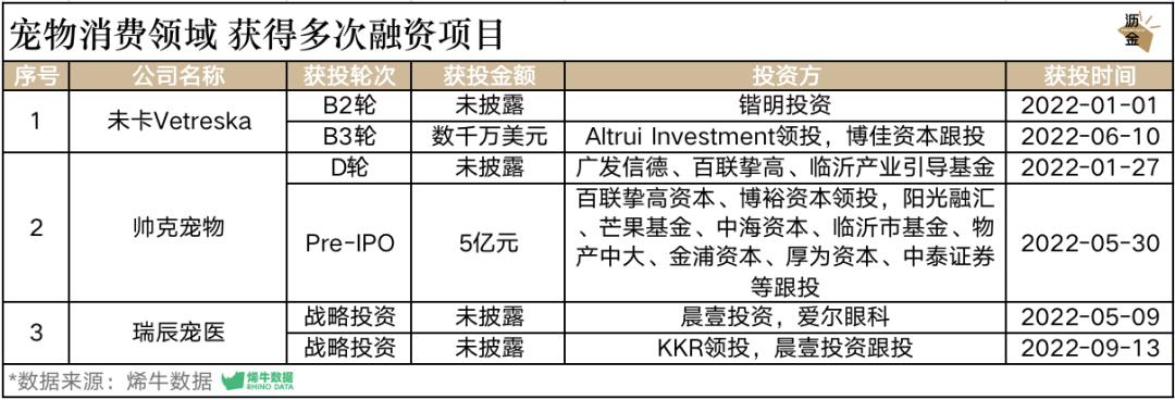 值得注意的是,时尚宠物生活方式品牌未卡Vetreska分别在今年1月和6月获得融资;宠物连锁医疗品牌瑞辰宠医也于5月和9月两次获得战略投资。