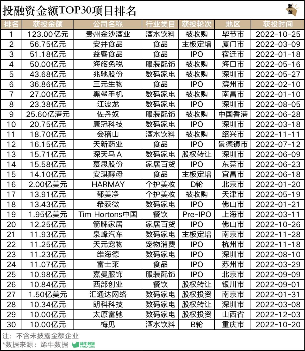 虽然综合机构对消费的重视程度下降,机构出手次数普遍下降,在估值评估上也更为谨慎,但2022年仍有部分项目得到了市场的认可。