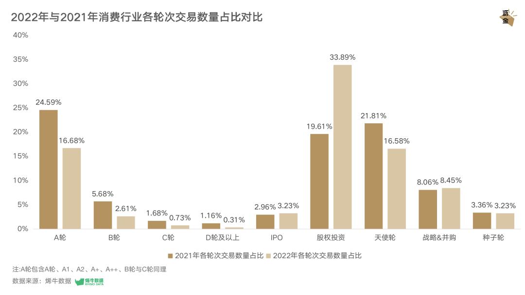 从轮次来看,2022年的消费行业投融资主要集中在天使轮及A轮,投资机构更愿意投资早期项目的创始人及创新产品。
