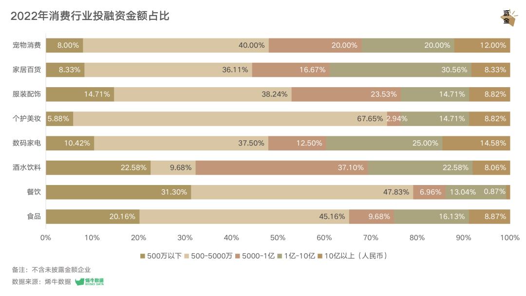 反应在投资标的上,就是投资总额的严重下滑。2022年的消费企业融资金额多数集中于500-5000万元人民币的区间。