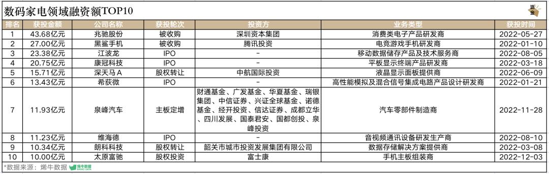 其中兆驰股份和黑鲨手机以43.68亿元和27亿元分别被深圳资本集团及腾讯投资收购;而江波龙、康冠科技、希荻微和维海德均通过IPO完成上市。