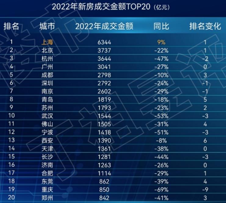 2022年新房成交金额最多的城市是上海,达到6344亿元,同比增长9%,是TOP20城市中唯一正增长的城市。