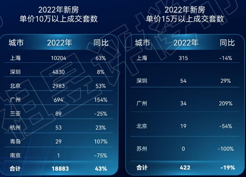 其中上海稳居第一名,2022年卖出14973套总价1000万以上新房,是唯一销售量破万的城市。