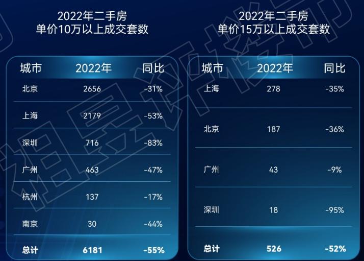 2022年,单价15万+二手豪宅成交量排名:上海(278套)、北京(187套)、广州(43套)、深圳(18套)。