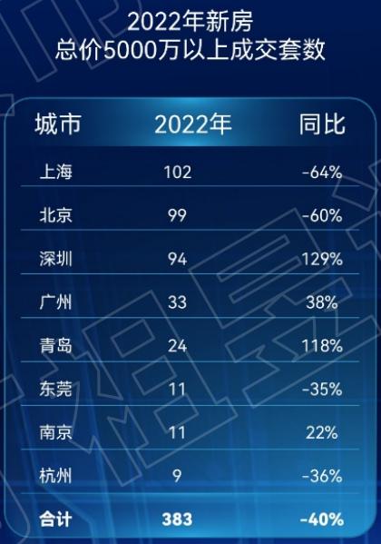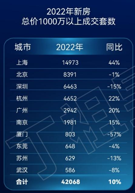 2022年,总价1000万以上新房卖得最多的十大城市依次为:上海、北京、深圳、杭州、广州、南京、厦门、东莞、苏州、武汉。