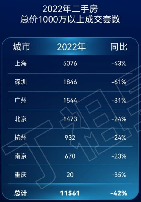 2022年,总价1000万以上二手房成交量排名依次为:
