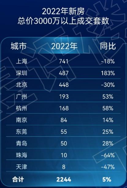 总价3000万以上新房成交量十大城市依次为:上海、深圳、北京、广州、杭州、南京、东莞、青岛、珠海、天津。