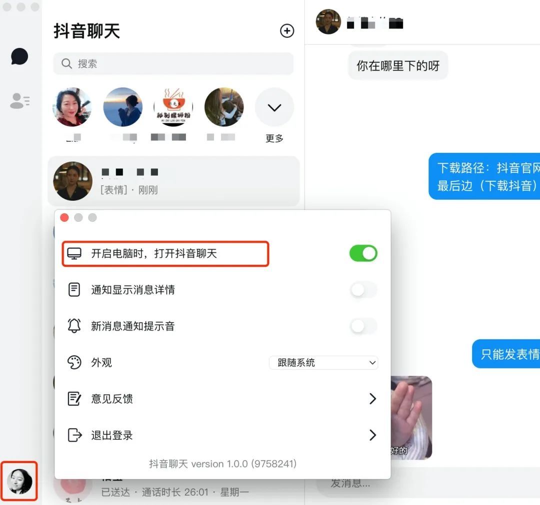 根据官网信息,该软件更新时间为2022年12月30日,最新版本为 1.0.0,提供Windows和Mac客户端,进入该软件需要使用抖音APP扫码登录。用户登录后,可以直接选择“开启电脑时,打开抖音聊天“。