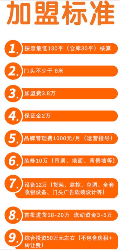 赛道竞争激烈,作为加盟商,加盟吖嘀吖嘀是否有利可图?江湖老刘在吖嘀吖嘀官网查到其加盟标准,按照最低130平(仓库30平)核算,门头不少于 8米,加盟费3.8万, 保证金2万, 品牌管理费1000元/月(运营指导) ,装修10万(吊顶、地面、背景墙等) ,设备12万(货架、监控、空调、全套收银设备、门头广告软装设计等),首批进货18-20万 ,流动资金3-5万, 综合投资50万元左右(不包含房租+转让费)。