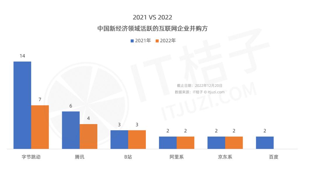 IT 桔子数据显示,2022 年中国新经济领域共发生 615 起并购事件,其中由字节跳动、腾讯、B 站、阿里巴巴、京东作为并购方的事件合计 18 起,占比仅 3%,较 2021 年降低 1 个百分点,较 2020 年降低 2.6 个百分点。