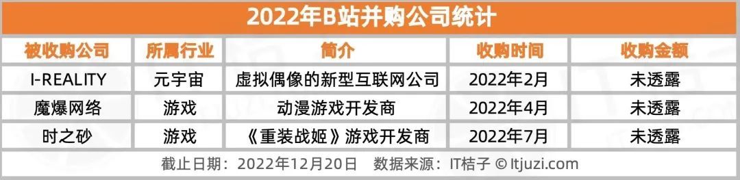 2019 年 4 月,B 站成立战略投资部。对于 B 站而言,稳定有黏性的用户是业务基础,在此基础上进一步扩充内容边界,丰富内容形式是关键。去年 B 站在打造内容平台上持续发力,以 6 亿元并购原创漫画梦工厂有妖气,又并购动画制作公司绘梦动画。到 2022 年,仅从并购这一角度来看,B 站从对内容平台的偏爱转向对游戏行业的布局。